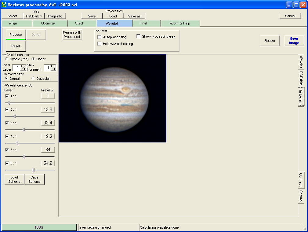 Registax は、Cor Berrevoets氏(オランダ)が2002年から公開しているフリーウェアです(現在はバージョン3として、http://registax.astronomy.net/からダウンロードできます)。多くの画像から自動的に良像を判定し、その位置合わせを行い、そして良像だけをスタック(コンポジット処理)してくれます。こうして得られた滑らかなノイズのないスタック画像から、さらにウェーブレット(wavelet)画像処理を行うことで、驚くような高解像度の惑星画像が得られます。
