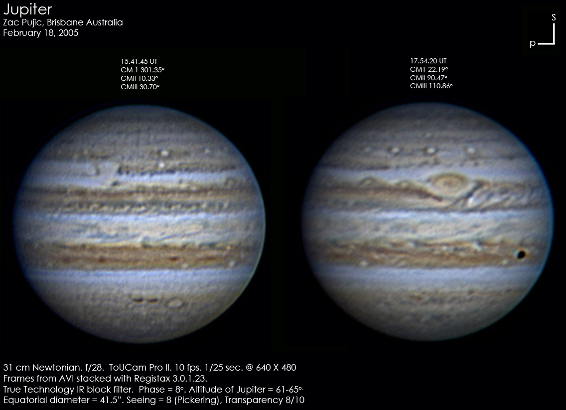 2005年2月18日の木星 画像:Zac Pujic(オーストラリア、31cm反射)(画像を拡大) |