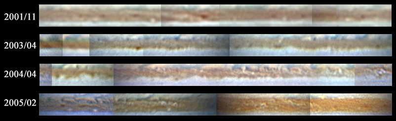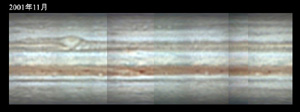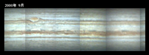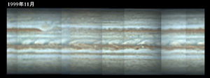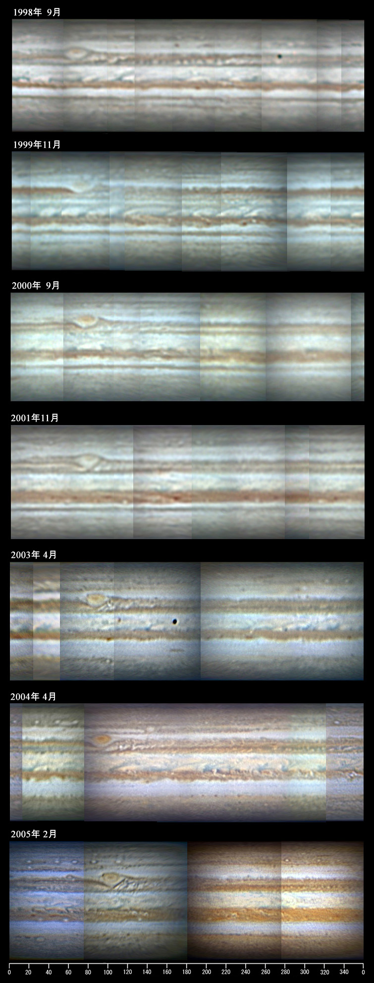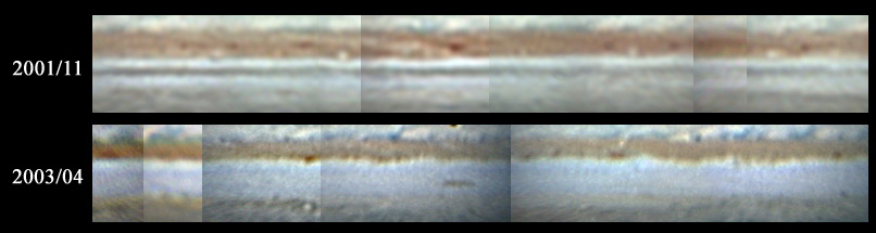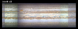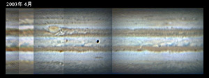近年のNTBは安定なベルトとして観測されていましたが、2002年12月に1ヶ月の間で一気に消失してしまいました。過去には、1956年から10年間、1969年・1978年・1988年にはそれぞれ2年間ほど消失した記録があります。再び、NTBが復活する際には、NTBsに明るい白斑が出現して急速に暗斑が広がっていくNTBs outbreakが見られることがあります(1970年, 1975年, 1980年, 1990年)。