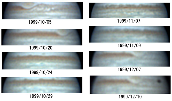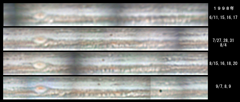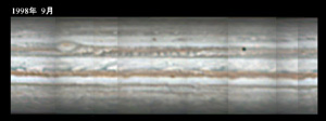 1998年に観測されたmid-SEB outbreakは、白斑の発生源がII=315°であり、大赤斑までの距離がもっとも長い分類に入るものでした。そのために、次々と発生する白斑群とその間を埋める暗柱が交互に並んだ様子と、次第に活動が治まっていく過程を観測することができました。
