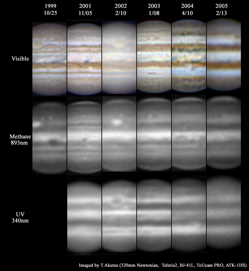 可視光で見る木星と異なり、種々の波長で観測することは、木星の大気の高さについての情報を得ることができます。メタンバンド(894nm)ではより高層のアンモニア雲を見ることができ、大赤斑やSTB白斑などが高層まで影響する模様であることが分かります。近紫外域(340nm)でも高層のヘイズを見ることができます。また、これらの継続的な観測から、2001年, 2003年のmid-SEB outbreakは高層まで影響のある現象であること、2003年に消失したNTBはメタンバンドでは全く変化の起こっていない現象であることなどが分かります。