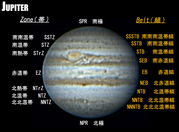 木星には、赤道に平行な何本もの縞模様が見られます。暗い模様は縞(ベルト)と呼ばれ、明るい模様は帯(ゾーン)と呼ばれます。それぞれに名前が付けられています。赤道を中心に南北に、赤道・熱帯・温帯というふうに、気象用語が用いられています。