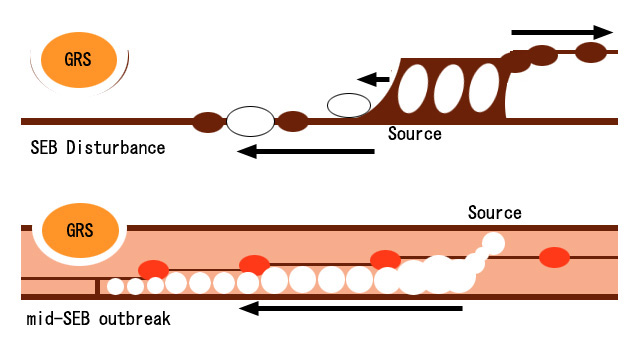 SEB撹乱がSEBが明化している状態から復活する現象であるのに対して、mid-SEB outbreakはSEBが濃化している状態で発生します。SEB南部に突然白斑が出現することから現象は始まり、同じ発生源から白斑が次々と発生します。発生した白斑群はSEB北部を急速に前進し、SEBのかなりの経度を埋め尽くします。outbreakの活動は、ほぼ大赤斑の後方に達すると消失します。