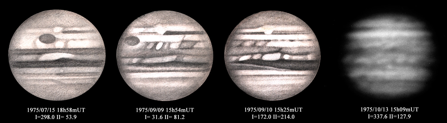 1975年のSEB撹乱は、7月5日にE.J.Reese(米国)が発見した暗柱を、国内では15日にようやく観測できました。この年のSEB撹乱は、8月に入ると2日, 13日, 17日と副次的な暗柱の発生があり、SEBがあちらこちらで複雑な暗柱や白斑によってかき乱されて濃化する様子がとらえられました。