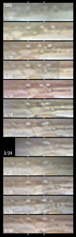 このベルトにはとても小さな白斑がいくつか並んでいます。大きさは4°程度しかありませんから、小中口径では難しい対象ですが、近年の観測技術の進歩で追跡が可能になりました。全周には6〜8個の反時計回転の小白斑が見られますが、最近ではその5個の小白斑が経度で90°以内に集中しています。 小白斑は思ったよりも東西方向にふらついていて、白斑同士の距離が広がったり狭まったりします。そして、2002年3月には接近しつつあった2個の白斑同士がついに合体(マージ)する現象をとらえることに成功しました。3月19日にくっつくばかりに接近した2個の白斑は、21/24日にはお互いの周りを左回りに巻き込むように回転し、26日には1個の白斑に合体しました。現在では90°の経度長の中に5個の白斑が密集していますから、再びマージが見られる可能性が高くなっています。