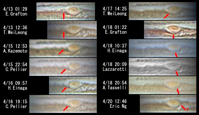 STrZに暗斑が発生することがあり、これが大赤斑まで後退してきて、大赤斑の周りの渦に巻き込まれる現象が見られます。最近では1997年5月, 2001年3月, 2002年11月, 2003年4月, 2005年3月に見られました。1997年の暗斑はボイジャー(1979年)が観測して以来初めて地上からとらえられたもの、2001年の暗斑はカッシーニ(2000年)によってドーナツ状の白斑であることが分かったもの、2003年の暗斑は大赤斑の周りをぐるりと左回りに移動する様子をつぶさにとらえたものです。