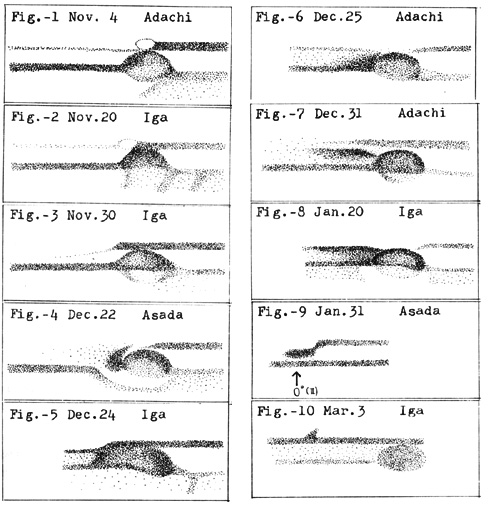 画像9 SEB撹乱(1975年) スケッチ/伊賀祐一(左:20cm反射、中左・中右:10cm反射)、画像/荒川 毅氏(奈良市、20cm反射)(画像を拡大) |