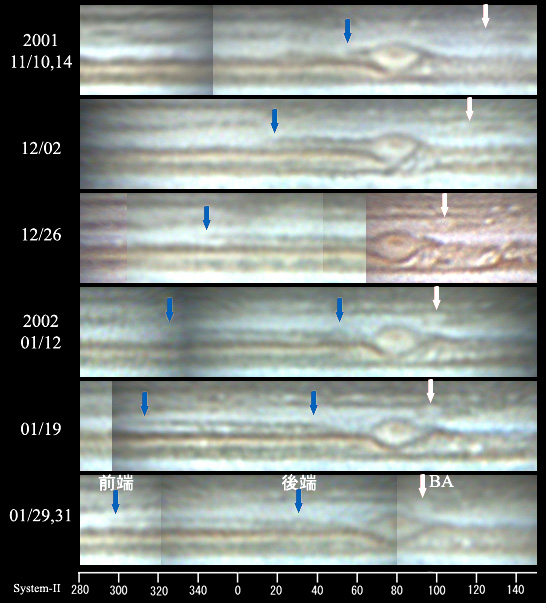 大赤斑の東(左)側に、暗い物質がベルト状に前方に伸びる現象が時々見られます。1985, 1987, 1990年と続いた後、最近では1998年8月, 2000年1月, 2001年11月と発生しました。このダークストリークは、SEBsを後退してきた暗斑群が、大赤斑の北をぐるりと回りこんできたものが、再度大赤斑の前方に噴出すように見える現象です。2001年の時は、2ヶ月間の活動の後で、ストリークの後端部がとらえられ、その後に急速に消失するまでの全ての様子がとらえられました。