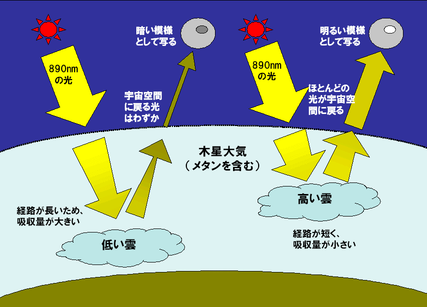 こうして、メタンバンド画像では、木星の模様の高低を知ることができるのです