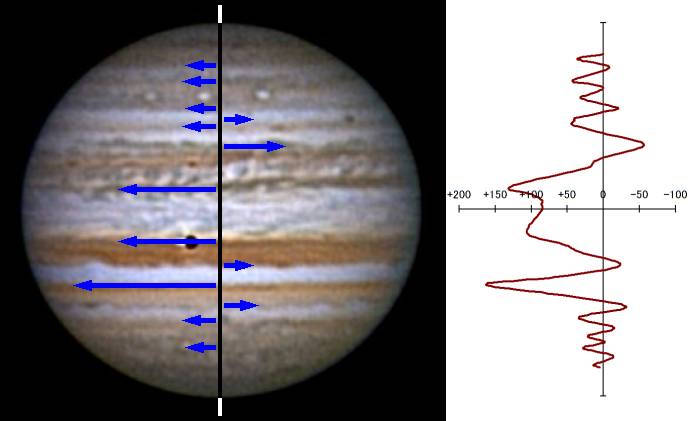 ベルトの赤道側には前進方向の、極側には後退方向のジェットストリームが存在する。 左はボイジャーによる風速データ。 |