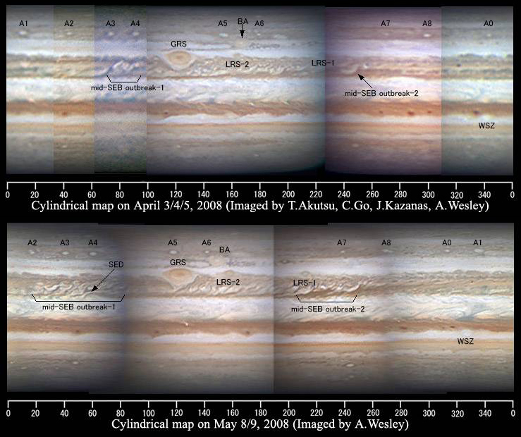 今年、木星面で最も活動的なのはSEBです。3月にmid-SEB outbreakと呼ばれる白