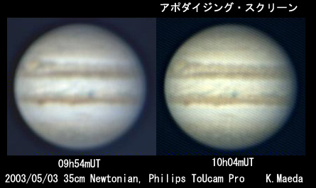 京都市亀岡市の前田和義氏からアポダイジング・スクリーンを使用した5月3日の木星画像を受け取りました。このスクリーンを使用した画像は明らかに画質が向上しています。前田さんの体験をご紹介しましょう。
