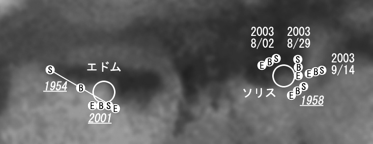 2001年6月8日に米国フロリダにおいてエドムの発光現象が観測されました(図左)。私は太陽−火星−地球の角度(i)に着目して調査したところ、火星の見かけの中央付近で起こった発光現象のほとんどが4〜6゜でした。2001年6月の時は5.1゜でした。これまで、火星面の中央付近で観測された発光はエドムとソリス付近とヘラス北部の3ヶ所だけです。2003年大接近では南極がこちらを向いているため、ソリス、ヘラス北部が発光の候補となります。2回以上発光が記録されているソリス付近をプロットしたのが図右です。
