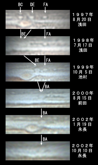 1997年には、かなり小さくなった3個の白斑が、非常に近い距離に集まっていました。そして、1998年3月の合をはさんで、前方の2個の白斑が合体したのです。さらに残った2個の白斑も距離が近くなり、2000年にはついに1個の白斑にまで合体して、現在観測できる'BA'だけになったのです。
