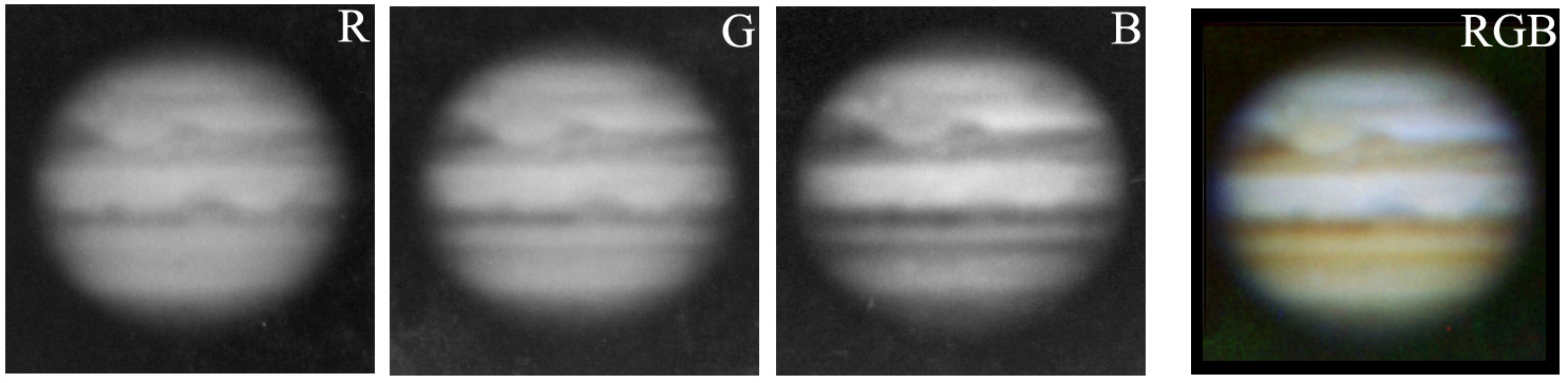当時、18cmの口径では脅威の木星のカラー画像と記憶している。今では大変面倒な作業と思われるが当時の機材ではこの方法はベストであり、これ以外は考えられなかった。撮影はTri-XやプラスXの白黒フィルムにRGB(Rの感度が弱いのでオレンジフィルターを代用)フィルターを付けて惑星(露出は数秒)を撮り、増感現像を行う。粒子の粗い惑星フィルムは各色とも5〜10枚のコンポジット合成白黒写真を作る。この時の惑星画像のリムはカラー合成の際、色ズレが少なくなる様、極力覆い焼きのテクニックを多用する。