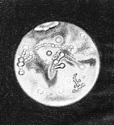 次に、生理的飛蚊症(ひぶんしょう)。望遠鏡や顕微鏡を高倍率で使用すると見えるものです(図)。年令と共に増加しますが、疲れている時にも増加します。観測日数が重なり疲れてくると、観測に大きな支障が出るくらい見えてきます。大きな塊は眼をくるくる回すと、しばらくの間、違ったところに移動しますが、すぐに元に戻ってきて再び見えなくしてしまいます。これをさけるには双眼アイピースを使用するのが効果的です。まずは疲れないようにすることが先決かもしれません。