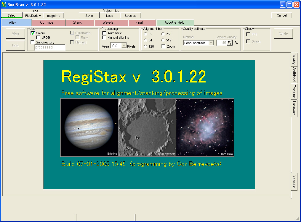 RegiStaxはオランダのCor Berrevoets氏によって、2002年5月に公開されたフリーなソフトウェアです。ToUcam PROやATKシリーズなどのWEBカメラで撮影された惑星の動画像を処理するためには欠かせないソフトの一つです。動画ファイルの入力を行うと、画像の位置決め(アライン)、画像の品質による最適化、画像の重ね合わせ(スタック)、Waveletによる画像処理などの一連の処理が自動化されます。