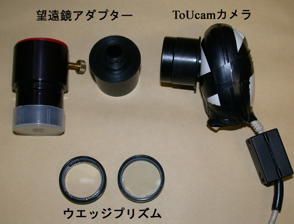 銀塩時代にはさほど問題にならなかった惑星撮像の際の大気差分散に伴う色ズレも、デジタル時代になり高解像度でシャープな画像が得られるようになるといやでも目立ってしまいます。撮影段階の色ズレ補正に眼鏡用のウエッジプリズムを用いることは、池村氏や熊森氏が既に試みておられます。私も以前は拡大系にXPを使用していたため、タカハシの拡大アダプターのフィルターボックスに眼鏡用プリズムを挿入していました。少し前から拡大レンズにバーローレンズを用いるようになってシステムを小さく出来ないかと考えた結果、ToUcamのアダプターにウエッジプリズムをフィルター枠に取り付け、システム全体の小型化をはかっています。加えて眼鏡用のプリズムは精度がどのようなものか不安がありますが、今使用しているオプトマックス製のものは1/4λですから安心感があります。