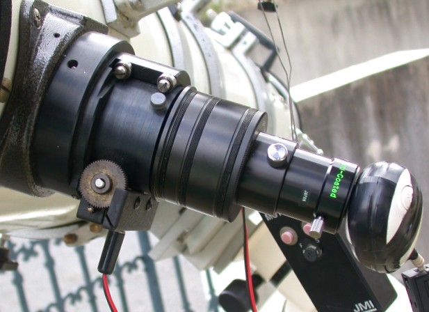 現在Jim’s Mobile製のNGF-S電動フォーカサー付きをオークションで入手し使っています。スピードコントローラーのつまみを最小位置にしても、ややピッチが荒いとは感じますが、モニターをそばで見ながらのピント調節が快適にできるようになりました。私のものはシュミカセの接眼部に取り付けるタイプのものですから、以前の接眼部のベースにタップを切って取り付けました。