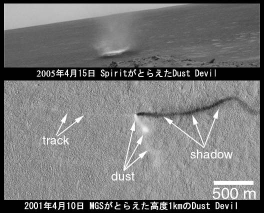 Dust Devilは、地球の砂漠などで頻繁に見られる現象で、地表付近の大気が日射で温められて上昇気流が発生し、竜巻のようにスピンしながら砂塵を巻き上げます。火星でも同様な現象が起こり、マーズ・グローバル・サーベイヤ(MGS)は上空1kmに達するDust Devilを観測していました(画像下)。MGSの画像では、Dust Devilの影や、砂塵が巻き上げられて地表がむき出した痕跡がとらえられています。