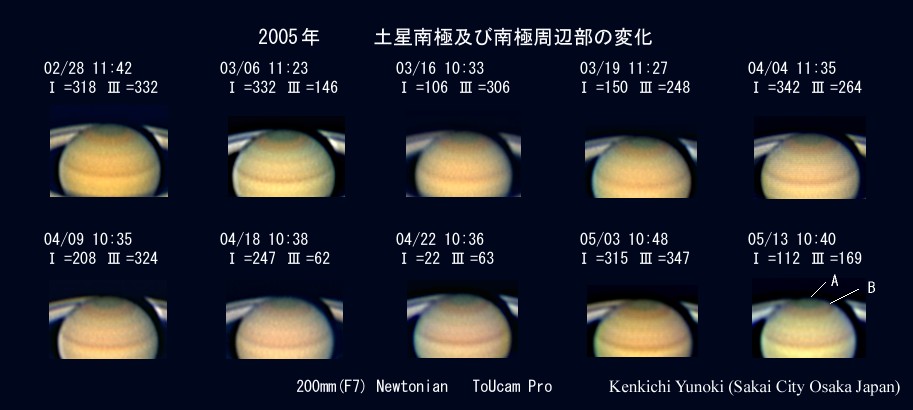 画像1 土星の南極およびその周辺部の変化 堺市、20cm反射、ToUcam PRO (拡大) |