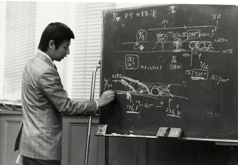 画像4 第2回木星会議の様子(1975年10月) 当時は持ち寄ったスケッチから黒板に整理をしていた。写真は平林勇氏。 (拡大) |