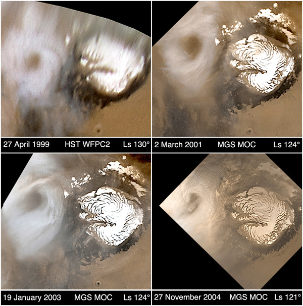 NASA/JPLの火星周回探査機マーズ・グローバル・サーベイヤ(MGS)は、1997年9月12日に火星軌道に達し、以来8年間(5火星年)に渡って観測を継続しています。MGSは、搭載する火星オービターカメラ(MOC)によって、火星の毎日の天気の変化を記録しています。この8年間でもっとも興味深い観測の一つが、火星面で繰り返し再現する気象パターンであると発表されています。