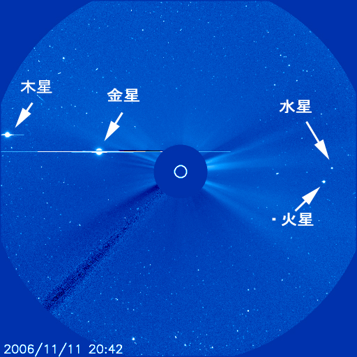 さて、このLASCO/C3コロナグラフの2006年11月11日UTの観測(画像8)を見ると、コロナの他に、木星・金星・火星・水星の4つの惑星が同じ視野に写っています。このような機会はめったにありませんし、このときにも1-2日の出来事でした。水星は動きが早く、この画像の3日前の11月8日UTには、水星の太陽面通過が起こりました。