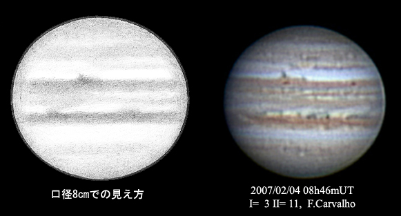 100倍の倍率があれば、木星に縞模様の見えることは良く知られています。倍率を上げても良いようなら、ぜひとも150倍くらいに上げてみてください。撹乱の起こっている面が地球のほうに向いていれば、図のように、見えてきます。無理に細かく見ようとせず、黒いでっぱりがどこに、どのくらいの大きさで見えるかを記録してください。