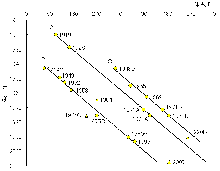 発生源の経度(体系III) = L + 0.018055 x (JD - 2422301) ここで、JD:ユリウス日