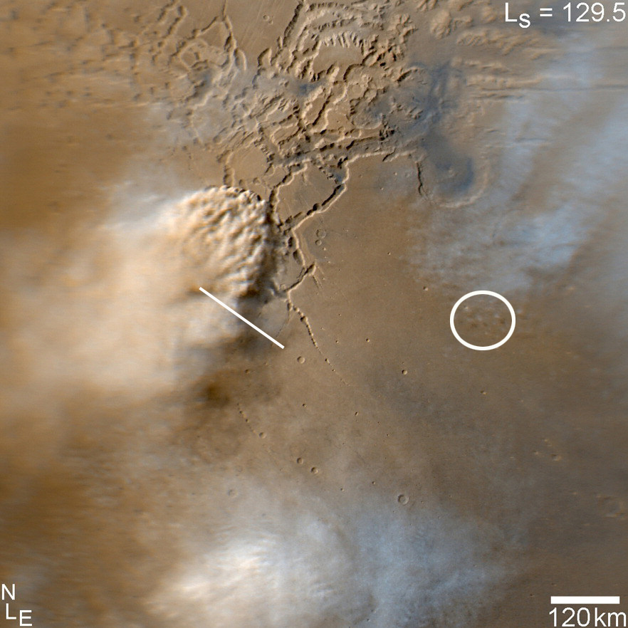 ました。右の円で囲んだところに、火星大気に浮かんだ積雲と思われる雲とその