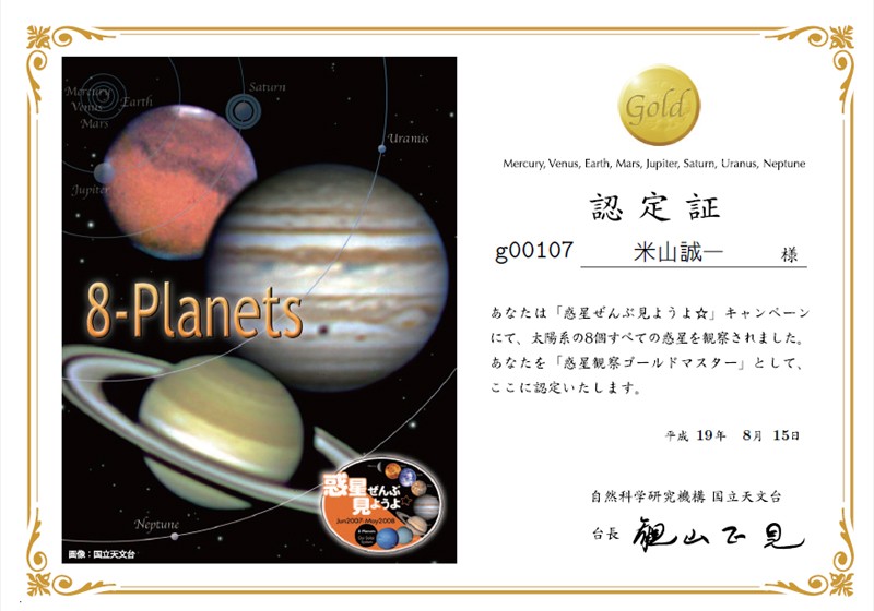 から海王星までの7惑星+地球を撮影してゴールド認定証を頂きました。