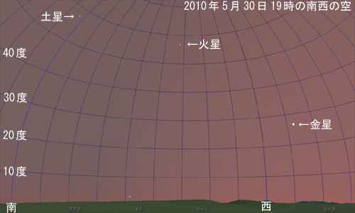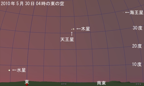 南東の空に木星と天王星、南の空に海王星が並び、日没後の西の空に金星、火星、