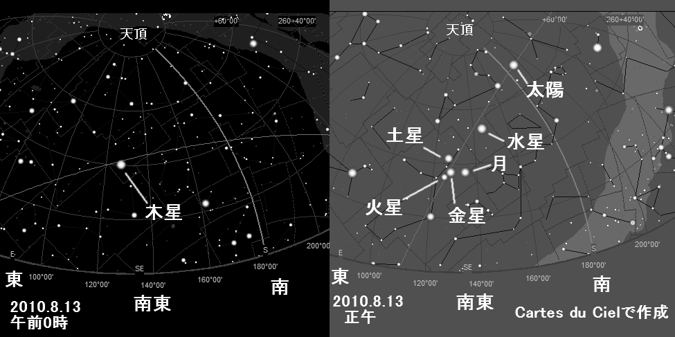 図は、左が8月13日の午前0時、右が13日正午に横浜から見た南東の空です。この