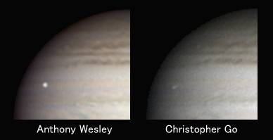 6月3日にアンソニー・ウェズレー氏によって観測された木星への小天体の衝突現