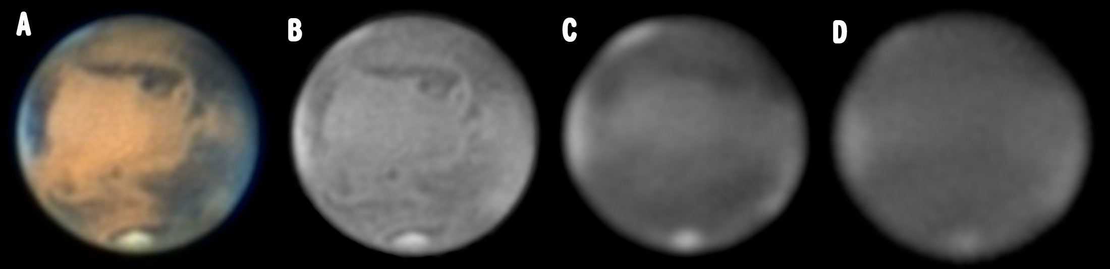 | A:LRGB合成の火星、B:LRGBの青チャンネル画像、C:3色分解撮影用の青フィルターで撮影(モノクロカメラ)、D:カラーカメラの青チャンネル画像。撮影:2012年3月13日、28cmシュミカセによる |
