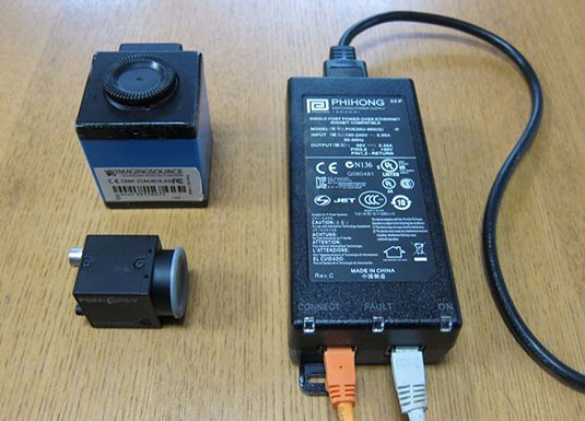 | 左手前がBlackfly、左奥は従来のDMK21-AU618。右はPoE用電源。 |
