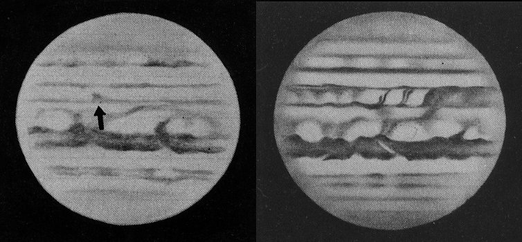 | 左) 1949年7月23日 攪乱発生初期の暗斑(矢印)。右) 1949年9月29日 攪乱が発達して、SEBに暗柱が多数見られる。誠文堂新光社、惑星ガイドブックより |
