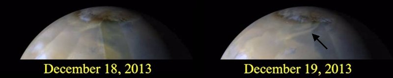 | 左は2013年12月18日、右は12月19日の同じ位置の画像。左の画像は北極冠からの吹き出し(矢印の先)が見られる。 |