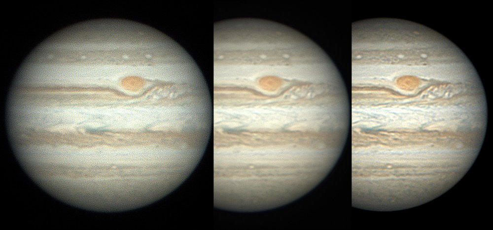 | 左からRegistax処理後、De-rotation後、復元処理後の画像。 |