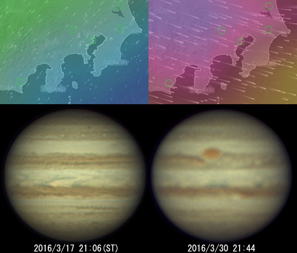 図は、上空3000mが南西風だった3月17日と、北西風だった3月30日のWindyty画面と木星画