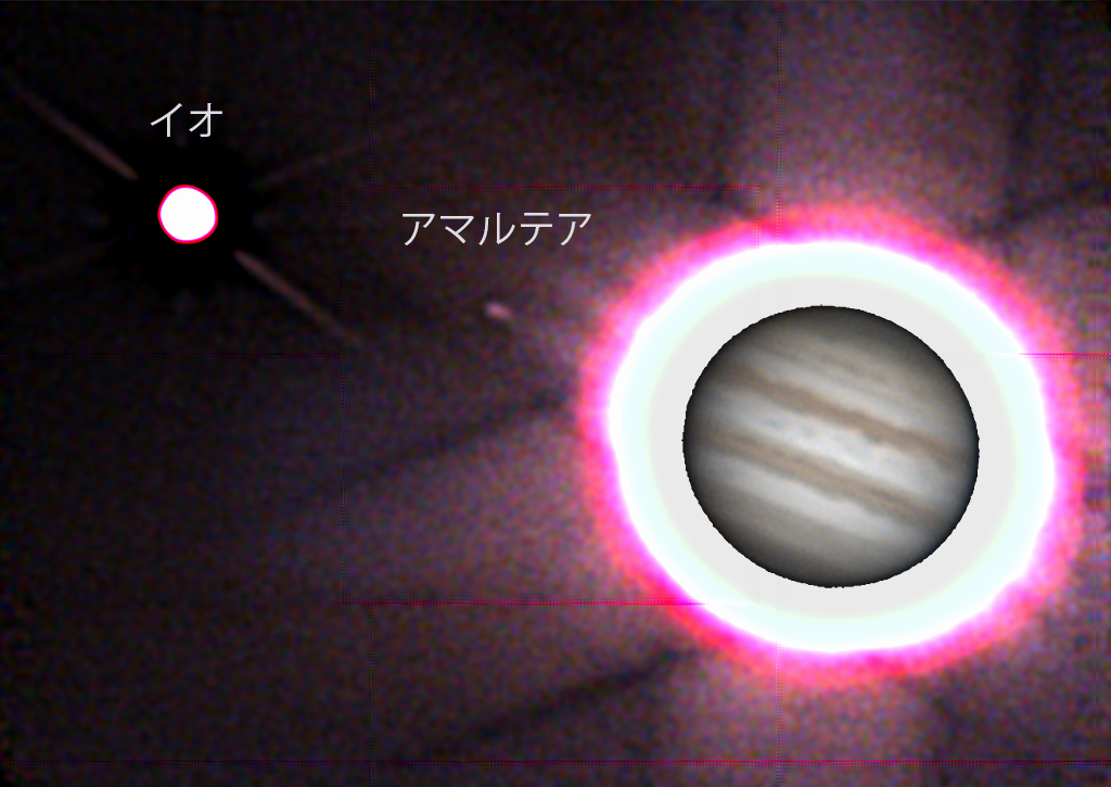 て視直径以上に広がった木星の光芒のサイズを、衛星がいるのであろう位置のやや手前ま