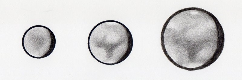 最近はアイピースの性能もよくなりました。 スケッチの例をあげておきますが、一番小さいものは視直径6秒の火星を30p400倍で見たものです。 模様は何とか見えますが、火星が明るく(表面輝度が高いため)形まではっきり見るのは、よほど気流が良くないと困難です。 中間の大きさは600倍ですが、火星の場合、模様が最もよく見えます。 もちろん気流が悪いとダメですが、いろいろ試すと模様は一番よく見えるようです。 800倍に上げると模様のコントラストが落ちて、模様は見えにくくなります。 焦点距離2mだと限界でしょう。 しかし火星の白雲は、光量が落ちるため見えやすくなります。 例に挙げたスケッチで見られるように、周辺部の白雲の位置や広がりはがぜん見えるようになるのです。