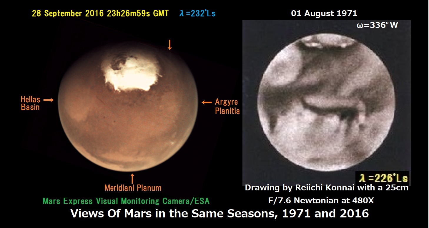 図では、1971年の私の眼視スケッチ観測(25cm反射、480倍)と、火星の同じ季節の2016年のVMCの南極上空からの画像を比較しました。 昇華縮小しつつある南極冠の周縁部のどのような複雑な状態を眼視で昔とらえていたのかがよく理解できます。