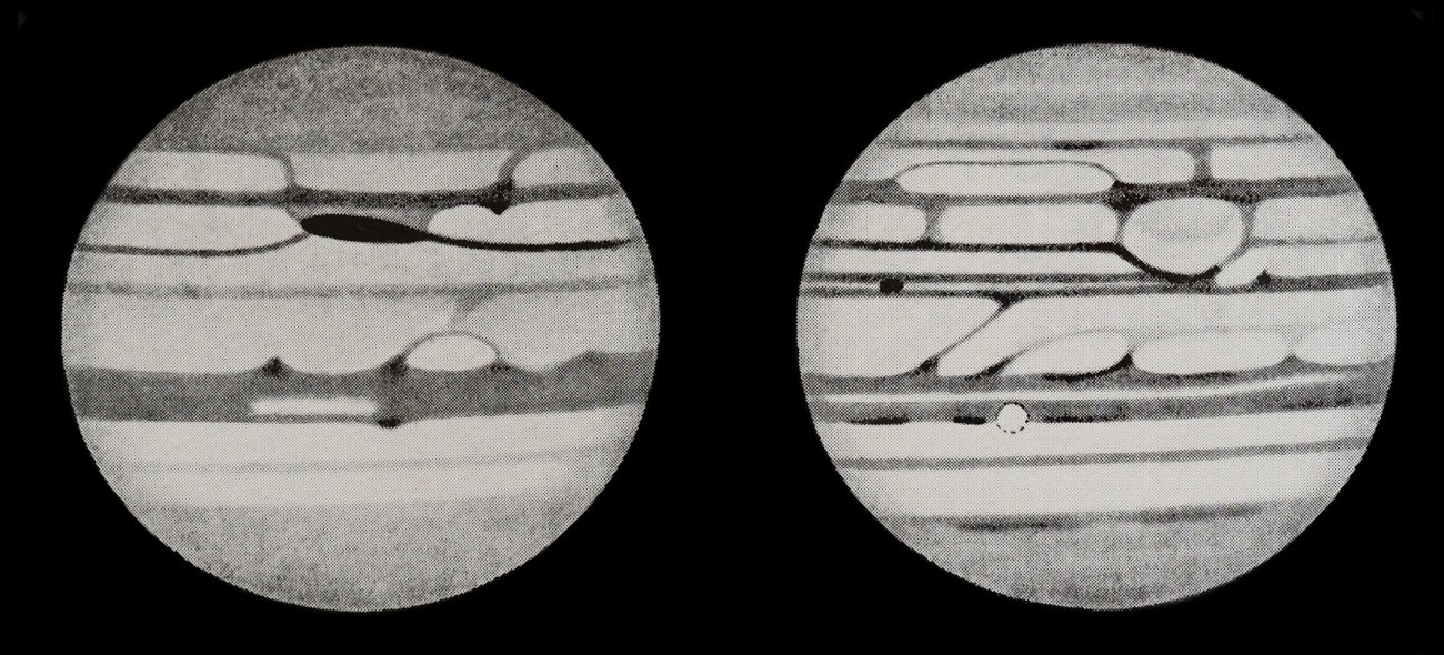 | 左:1947年2月11日 23:11 中央は南熱帯攪乱。右:1947年6月9日 16:25 赤斑孔と大きな永続白斑。15cm反射による。 |