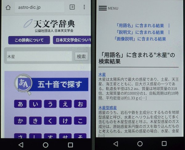 今年の春に、日本天文学会が「インターネット天文学辞典」を公開しました。 URLは、http://astro-dic.jp/です。 もちろん、スマフォでも見られます。 特長は関連する用語も合わせて表示されることと、画像はもちろんですが、動画も見られることです。 検索すると、「用語名」「説明文」そして「画像説明」に含まれるものの三種類の結果が表示されます。 ちょっと難しそうで面白そうです。
