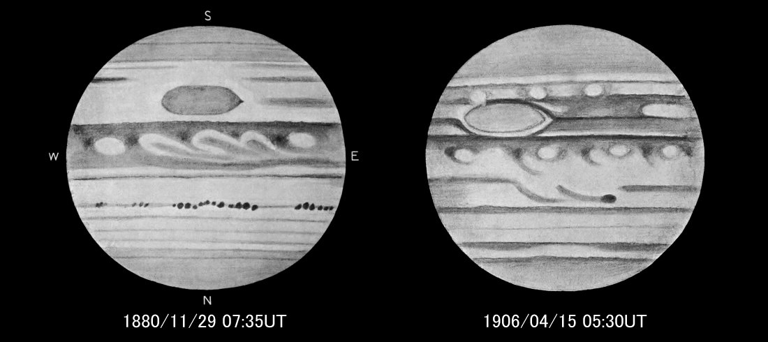 | 左) 大きな大赤斑と北温帯流-Cの暗斑群。右) 大赤斑とその後方に南熱帯攪乱。 |