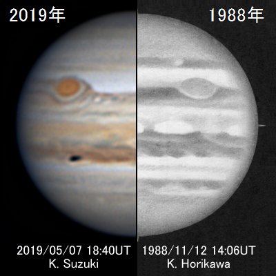 1988年に右側に見えていた大赤斑は、30年かけて木星面の裏側をぐるりと回り、左側から顔を出したことになります。