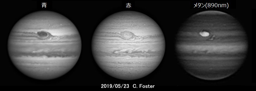 メタンバンドと呼ばれる波長890nmの赤外線だけを通すフィルターで撮像された画像も重要です。 木星大気に含まれるメタン分子は、890nmの光を吸収する性質があります。 木星の高い所にある雲は、太陽光が木星大気を通過する長さが短いので吸収量が小さく、低い雲では反対に吸収量が大きくなります。 したがって、波長890nmによる木星像の明暗は、雲の高低を反映し、高い雲は明るく、低い雲は暗く見えるのです。