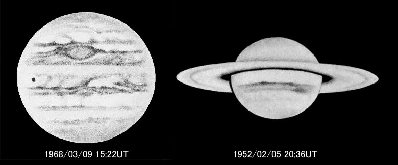 | 左) 1968年の木星。中央上に大赤斑が見られる。右) 1952年の土星。北赤道縞上に大澤斑点が描かれている。 |